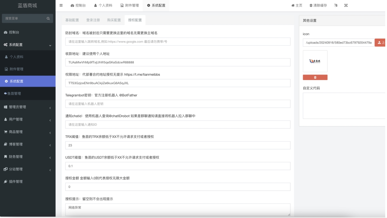 蓝盾发卡商城授权源码 发卡系统商场平台 域名防封 TG通知 前端html 后端php